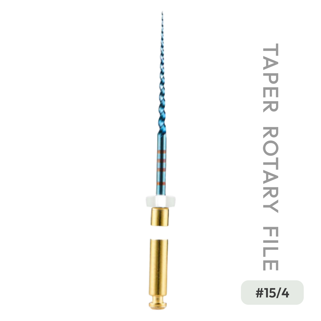 Heat-treated NiTi rotary file #15/4% taper and 21mm length for flexible, fatigue-resistant shaping in narrow, curved canals.